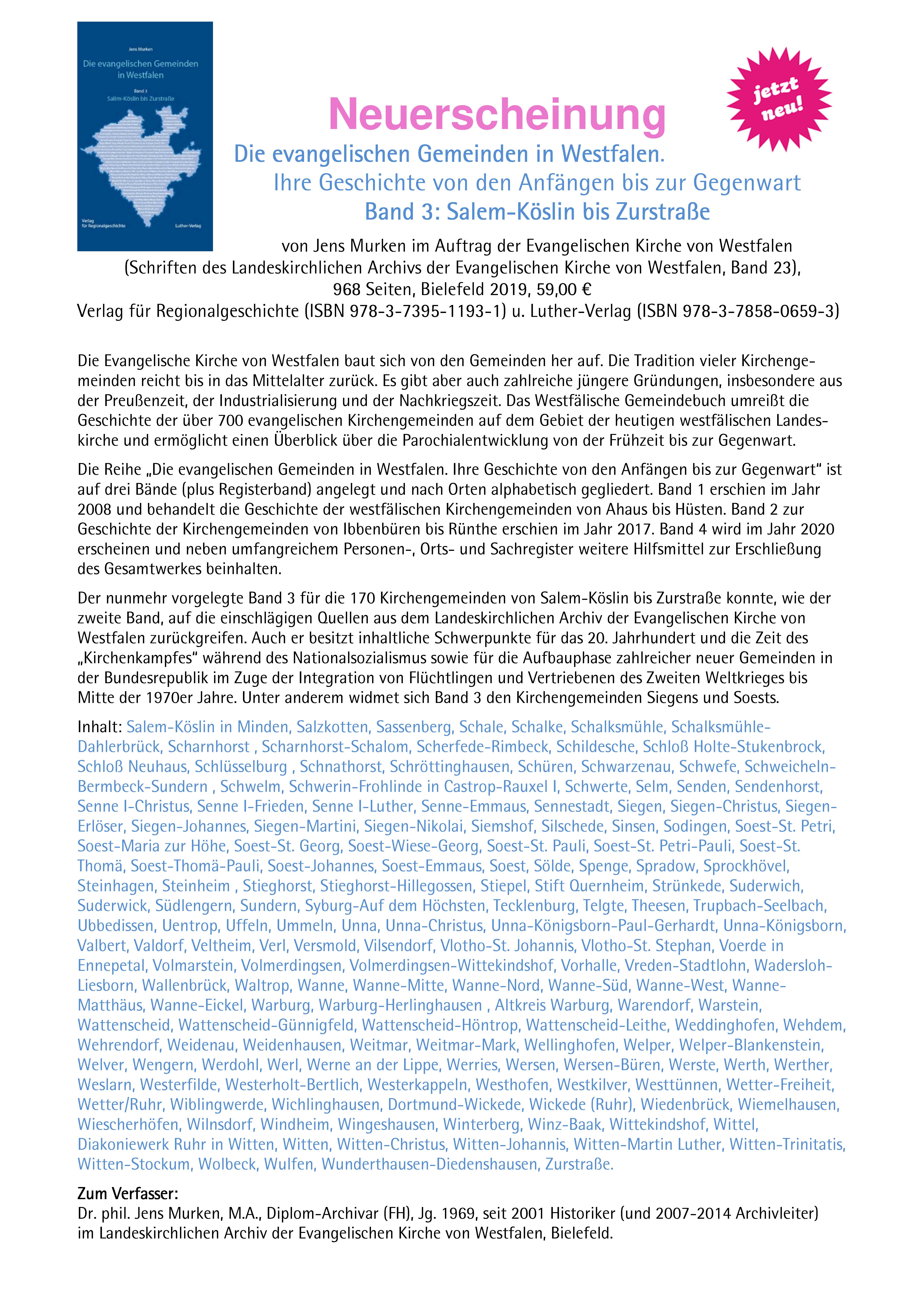 Dr. Jens Murken. Geboren 1969 in Bremen. Studium: Geschichtswissenschaft, Theologie und Archivwissenschaft in Münster und Potsdam. Historiker im Landeskirchlichen Archiv der Evangelischen Kirche von Westfalen.