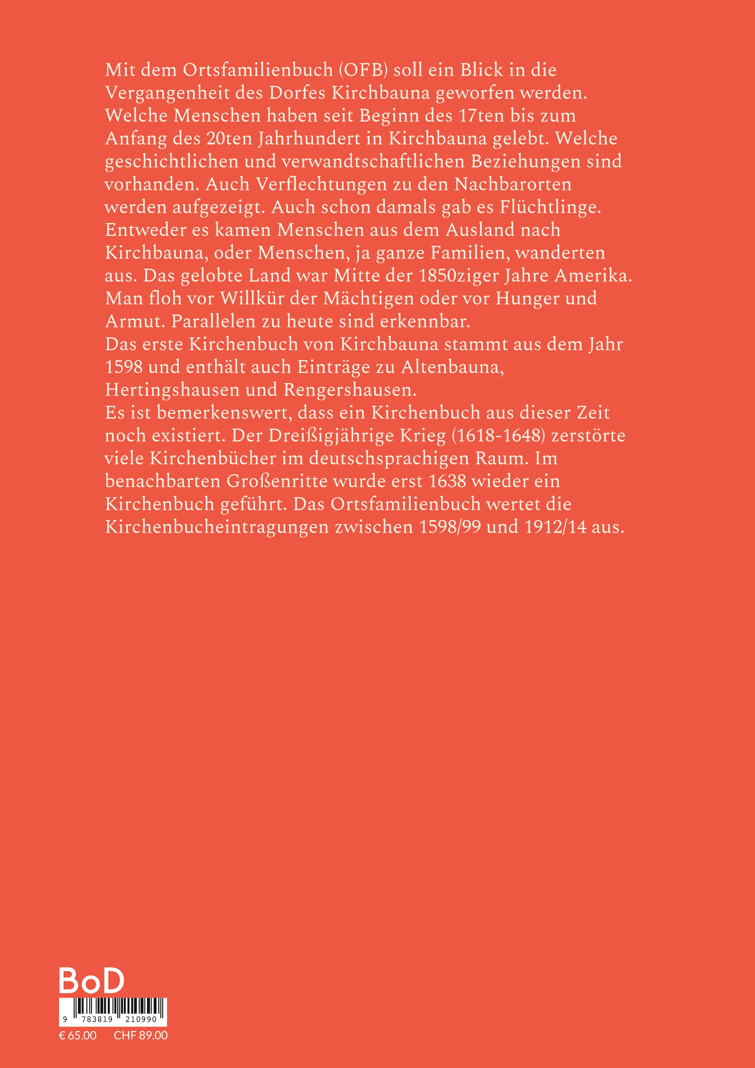 Mit dem Ortsfamilienbuch (OFB) soll ein Blick in die Vergangenheit des Dorfes Kirchbauna geworfen werden. Welche Menschen haben seit Beginn des 17ten bis zum Anfang des 20ten Jahrhundert in Kirchbauna gelebt. Welche geschichtlichen und verwandtschaftlichen Beziehungen sind vorhanden. Auch Verflechtungen zu den Nachbarorten werden aufgezeigt. Auch schon damals gab es Flüchtlinge. Entweder es kamen Menschen aus dem Ausland nach Kirchbauna, oder Menschen, ja ganze Familien, wanderten aus. Das gelobte Land war Mitte der 1850ziger Jahre Amerika. Man floh vor Willkür der Mächtigen oder vor Hunger und Armut. Parallelen zu heute sind erkennbar. Das erste Kirchenbuch von Kirchbauna stammt aus dem Jahr 1598 und enthält auch Einträge zu Altenbauna, Hertingshausen und Rengershausen. Es ist bemerkenswert, dass ein Kirchenbuch aus dieser Zeit noch existiert. Der Dreißigjährige Krieg (1618-1648) zerstörte viele Kirchenbücher im deutschsprachigen Raum. Im benachbarten Großenritte wurde erst 1638 wieder ein Kirchenbuch geführt. Das Ortsfamilienbuch wertet die Kirchenbucheintragungen zwischen 1598/99 und 1912/14 aus.